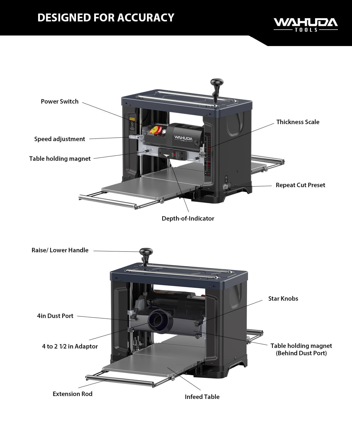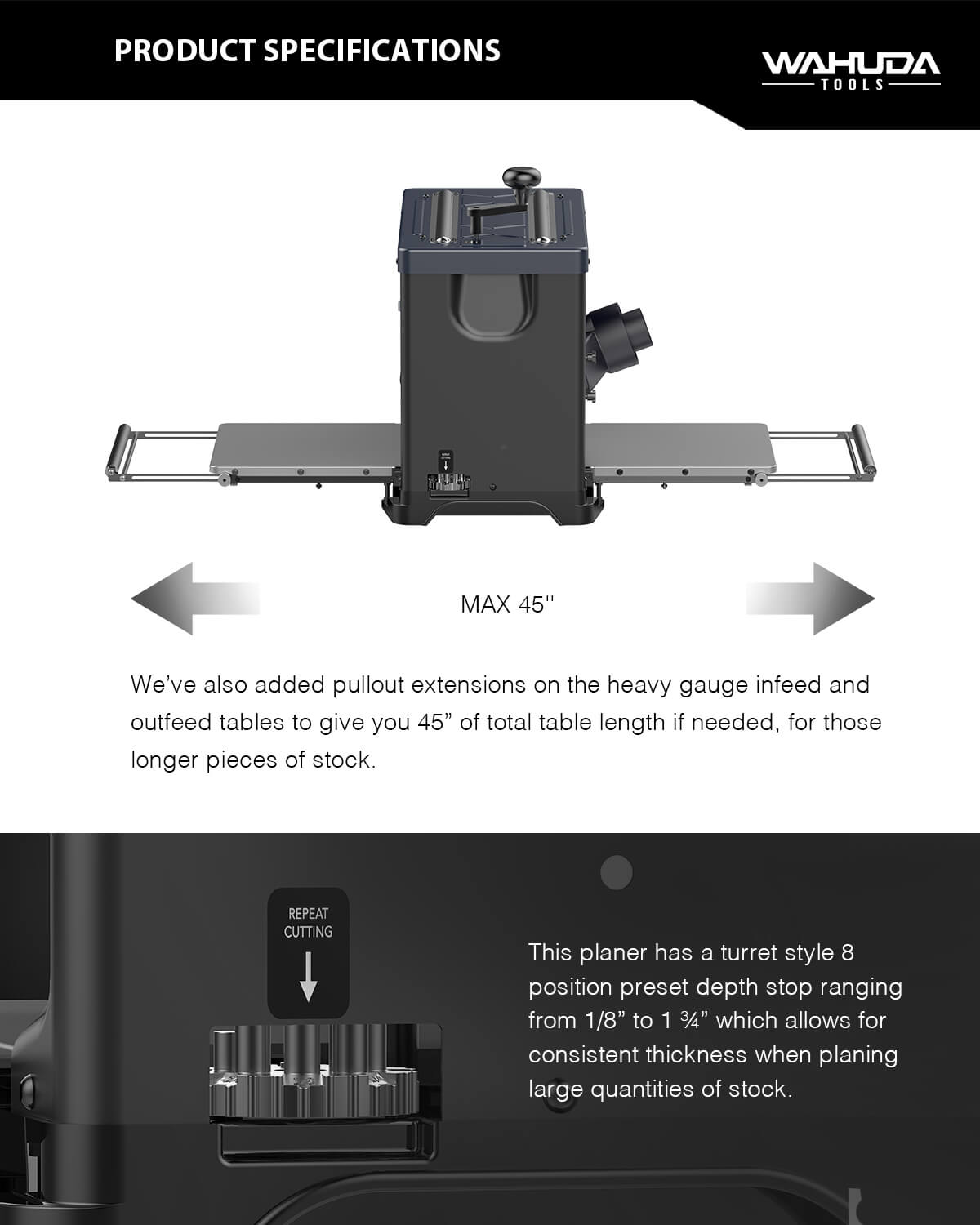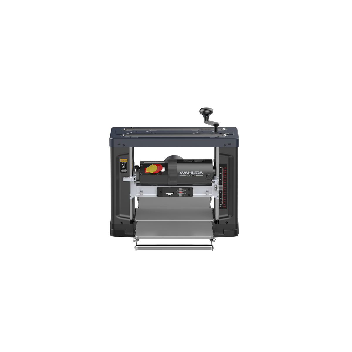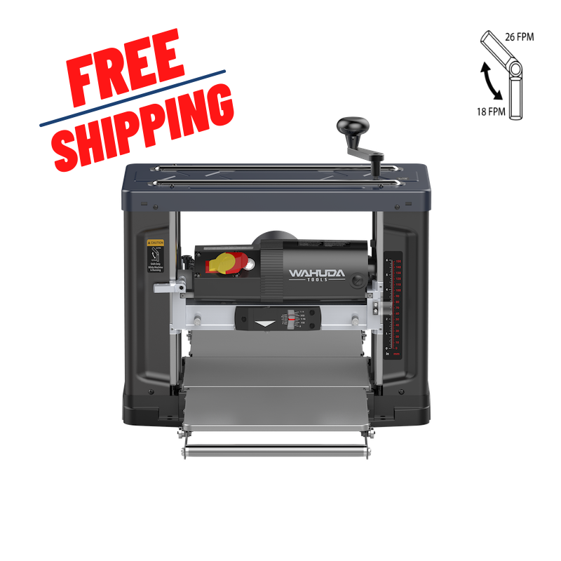 The 60200PC-WHD has 2 feed speeds, 26 fpm for regular every day production type planing, or 18 fpm, which will provide a finer finish on figured stock. As with our Wahuda spiral style cutterhead machines, our planer comes with 4-sided carbide inserts already installed. And we’ve have made it quick and easy to access the cutterhead, for insert rotation or replacement, by adding star knobs to the 4 inch dust port and dust chute screws that can be quickly removed by hand without a tool. Also included is a 4 inch to 2 ½ inch dust port adapter. We’ve also added pullout extensions on the heavy gauge infeed and outfeed tables to give you 45” of total table length if needed, for those longer pieces of stock. If even longer pieces of lumber need machining, you can always add additional supports…such as roller stands. And the tables and pullout extensions are easily adjusted to get them coplanar to the center wear plate.Weighing in at about 77 lbs, it can be moved around your shop for easy access. This planer has a turret style 8 position preset depth stop ranging from 1/8” to 1 ¾” which allows for consistent thickness when planing large quantities of stock. It has a standard stock capacity of 13” W X 6” H with a 1/8” maximum depth of cut. (1/32” max depth of cut at 10” wide and above). The powerful 120 V 15 amp motor, which equates to about 2.2 HP, will keep up with any stock you throw at it. CAUTION: The speed selector switch should only be changed while the machine is running and not under load. Otherwise, damage will occur to the speed selector mechanism.