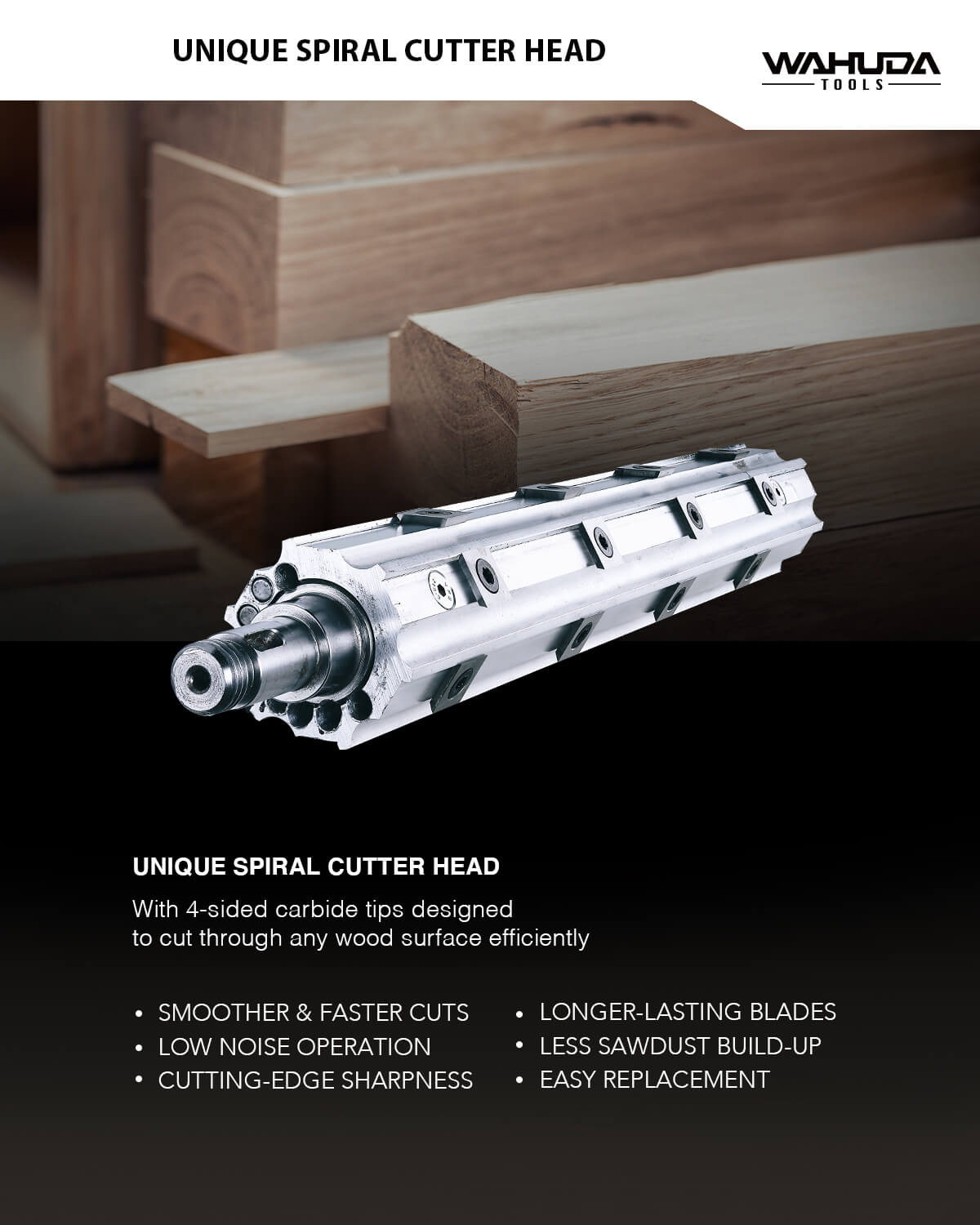 • Spiral cutterhead with 4-sided carbide inserts installed are cost-effective and easily-maintained that Inserts easily rotated or swapped out when dull